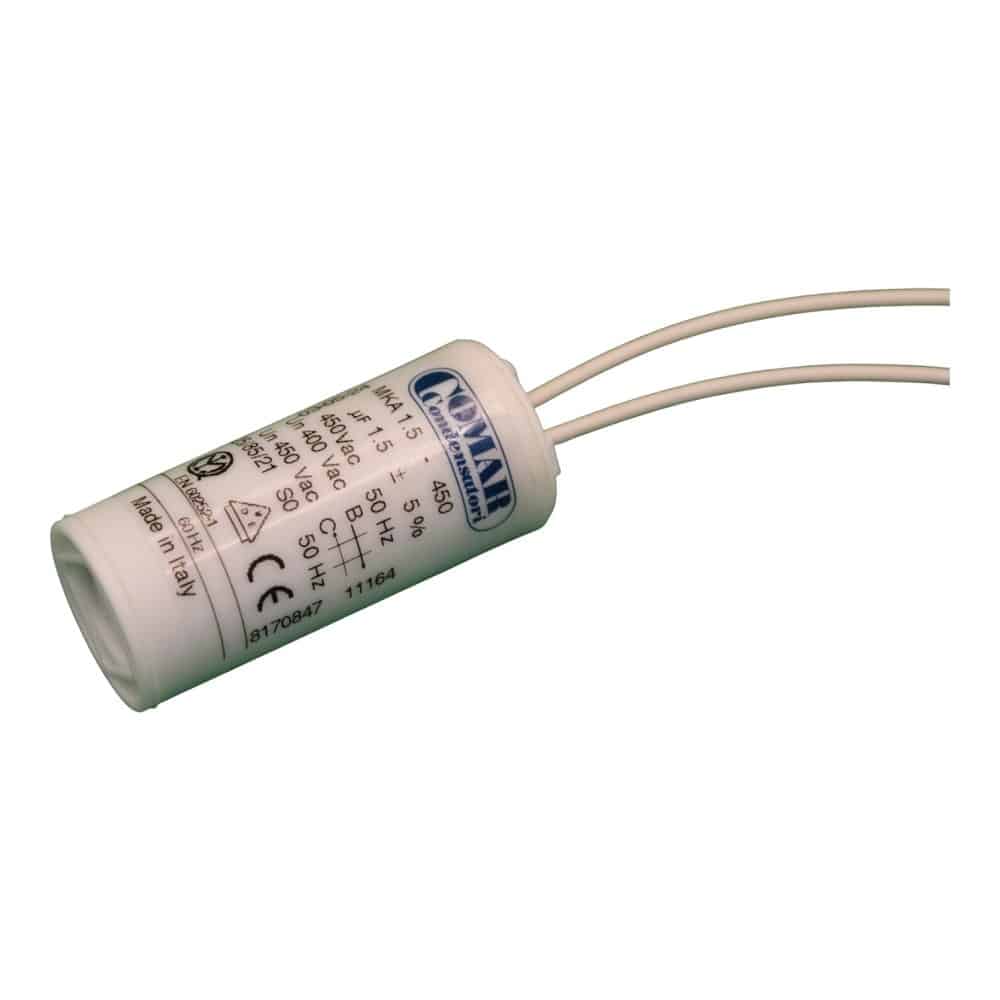 Condensateur COMAR MKA1.5-450 1.5µf 450V (1.5 microF ou 1.5 microfarads) pour moteur et pompe électrique mono. La fonction du condensateur est de créer le déphasage nécessaire à la rotation de moteur asynchrone monophasé. Fréquemment, les défauts des moteurs monophasés proviennent du condensateur permanent. De plus, la défaillance du condensateur entraîne rapidement la mise hors service du bobinage ce qui impose le remplacement du moteur ou de la pompe. En conséquence, il faut veiller à utiliser un produit de grande qualité et la fiabilité du condensateur est particulièrement importante. Pour cette raison nous avons choisi de travailler avec COMAR un grand fabricant dont la réputation n’est plus à démontrer.