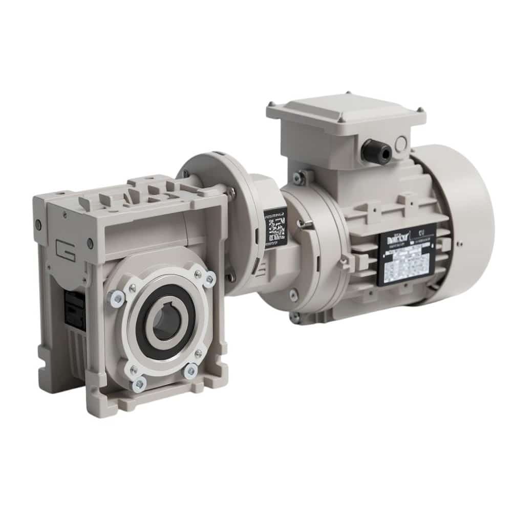 Motoréducteur roue et vis Transtecno CMP090-075 1.1kW 380V triphasé réalisé par l’assemblage d’un réducteur CM075, d’un étage d’entrée PG et d’un moteur asynchrone triphasé. L’utilisation d’un train d’engrenage d’entrée du roue et vis permet d’obtenir des vitesses de sortie plus faible. Le réducteur est étanche et lubrifié à vie par une huile synthétique longue durée. Le moteur IP55 est équipé de roulements de grande marque et d’un bobinage de classe F. L’ensemble peut se monter dans toutes le positions aussi bien verticales que horizontales. De plus, il peut être piloté avec un variateur de fréquence. Enfin, vous pouvez vous procurez en option sur notre site des kits de sortie: bride, arbre plein simple et double et bras de réaction.